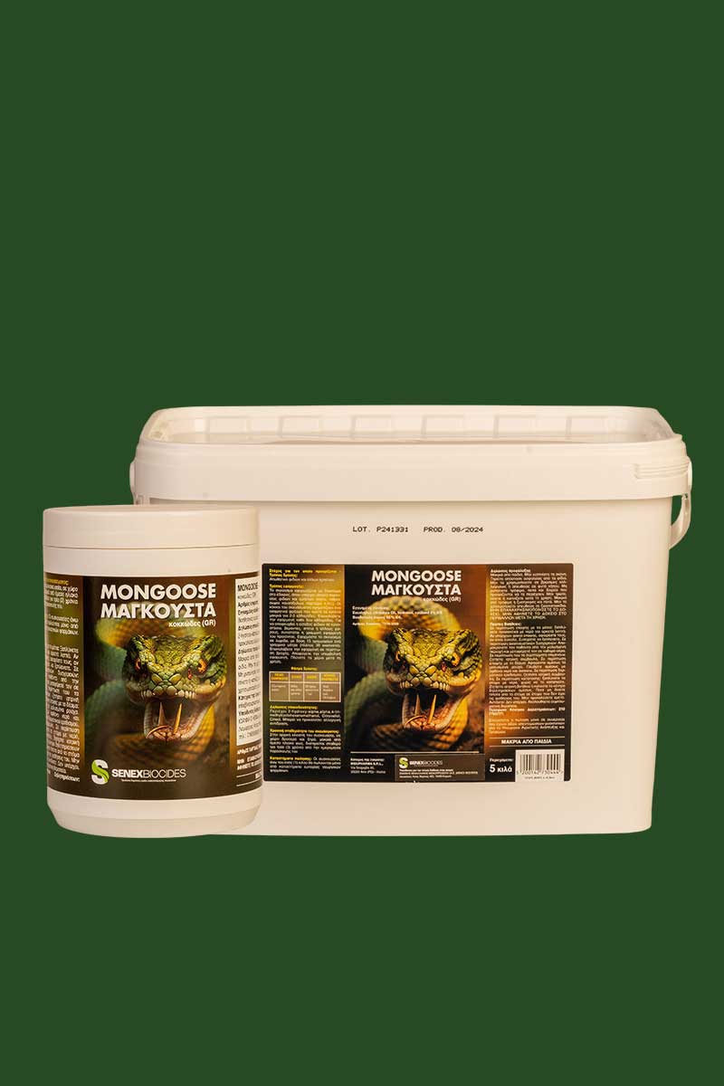 Περιγραφή & Τρόπος Δράσης: Το MONGOOSE – ΜΑΓΚΟΥΣΤΑ είναι ένα κοκκώδες σκεύασμα που δημιουργεί ένα ισχυρό οσφρητικό φράγμα στο έδαφος, αποτρέποντας την είσοδο φιδιών και άλλων ερπετών σε προστατευμένους χώρους. Η δράση του διαρκεί για περίπου 2-3 εβδομάδες.